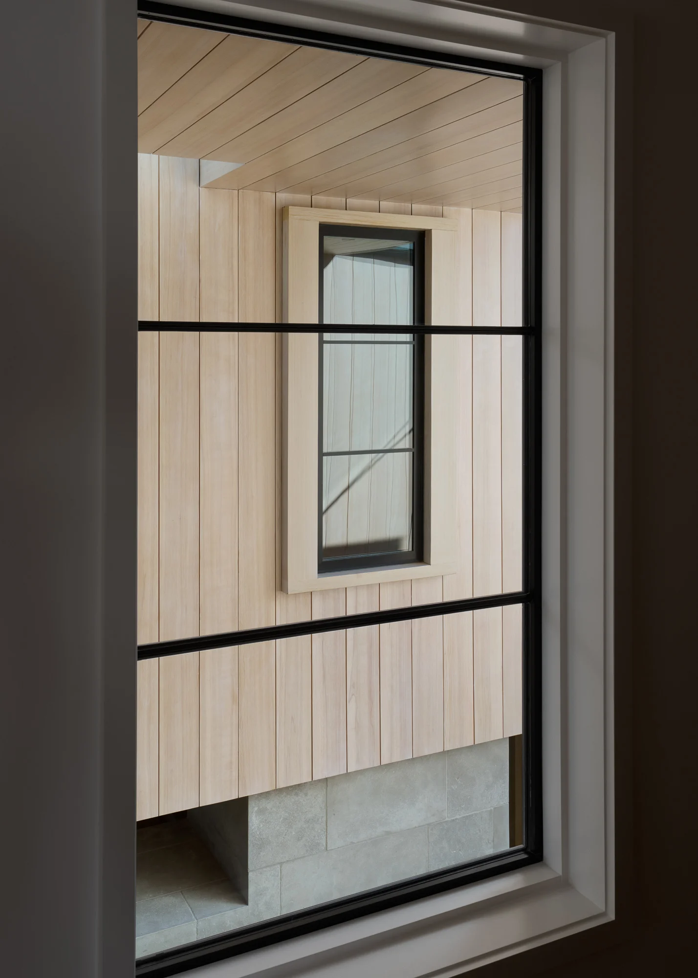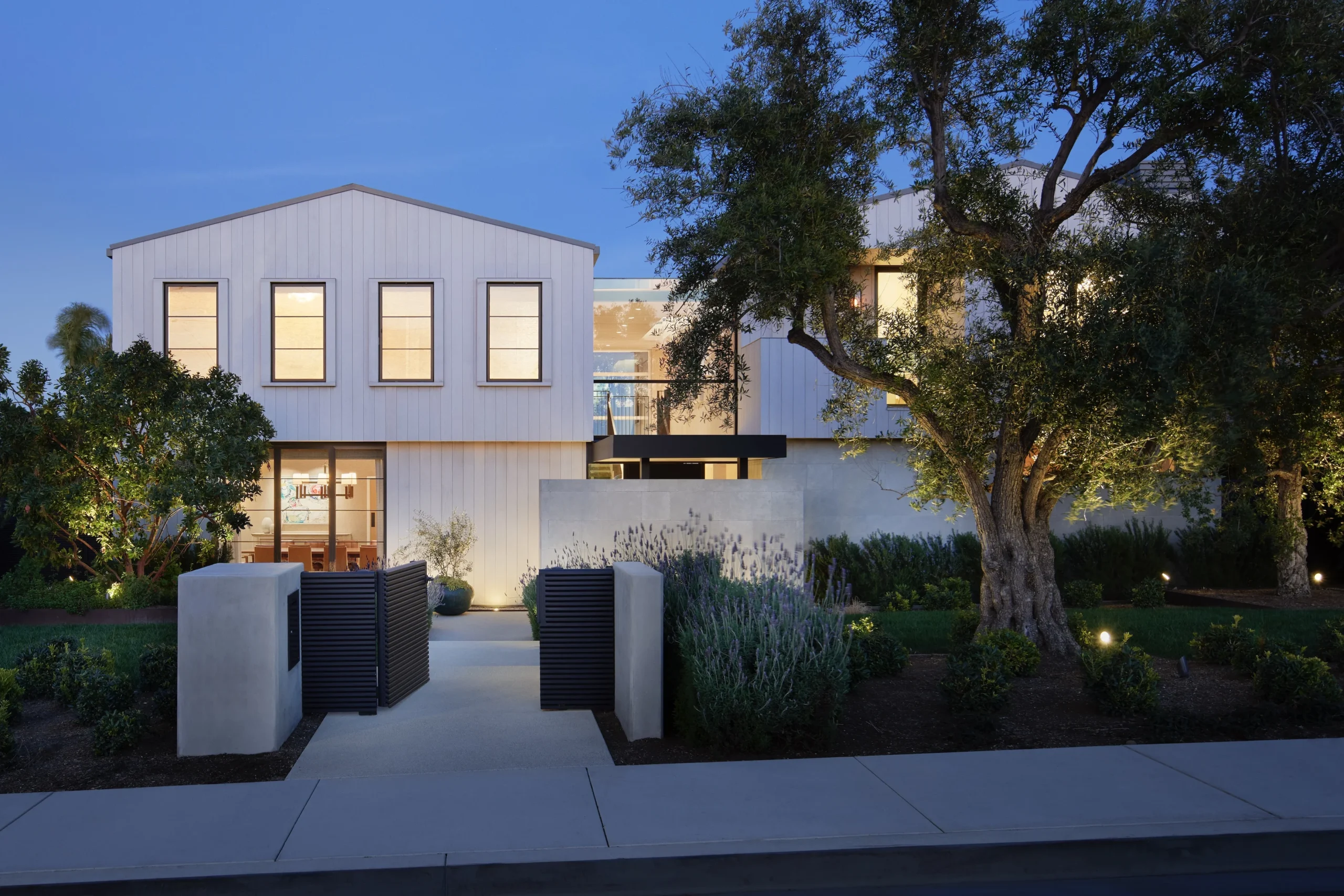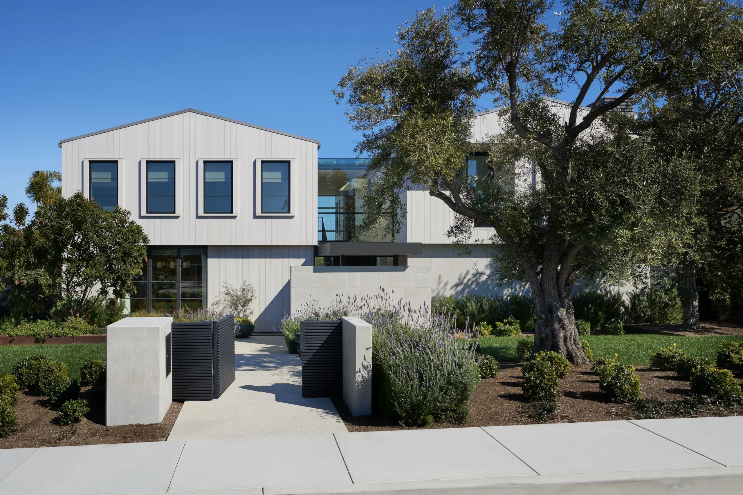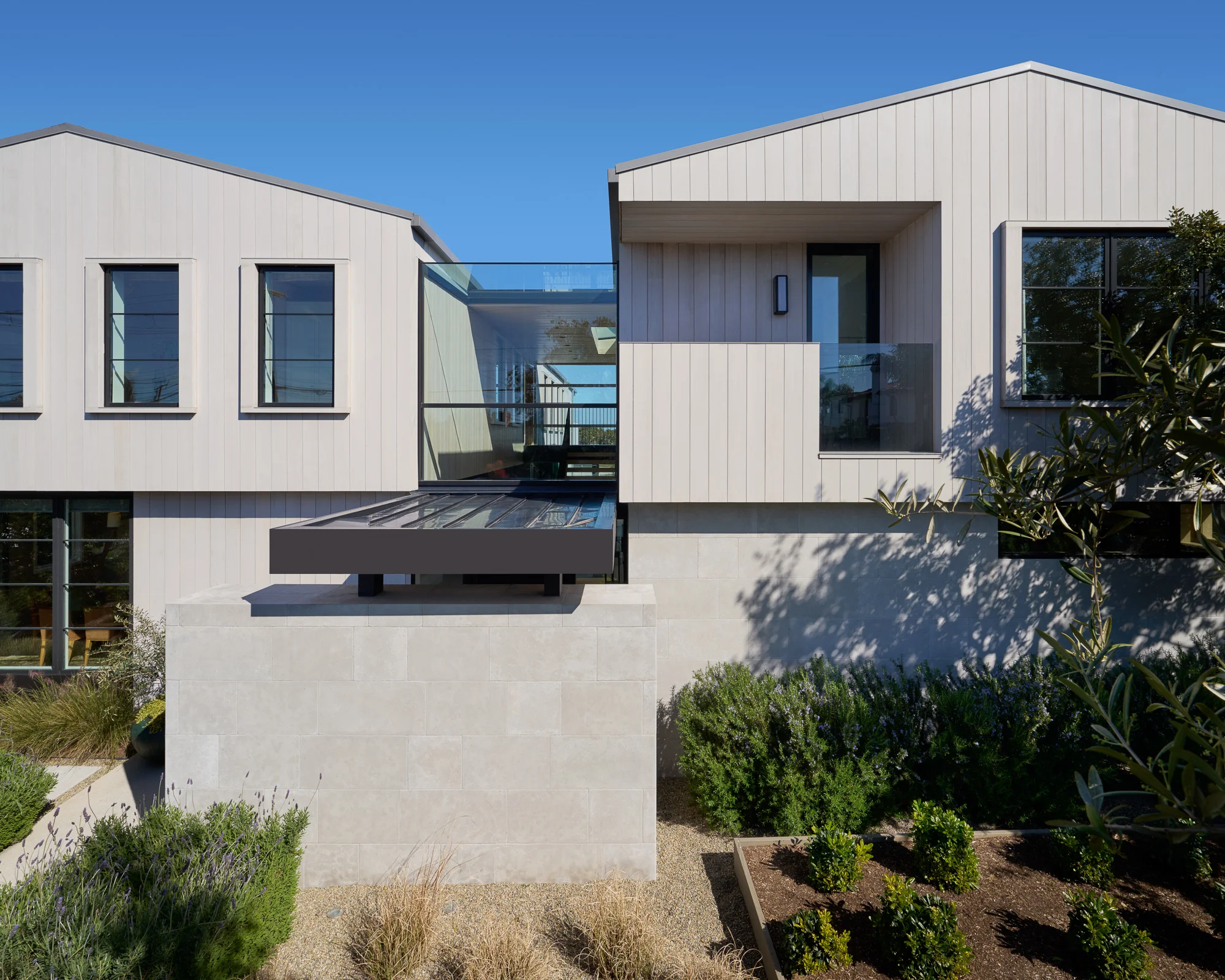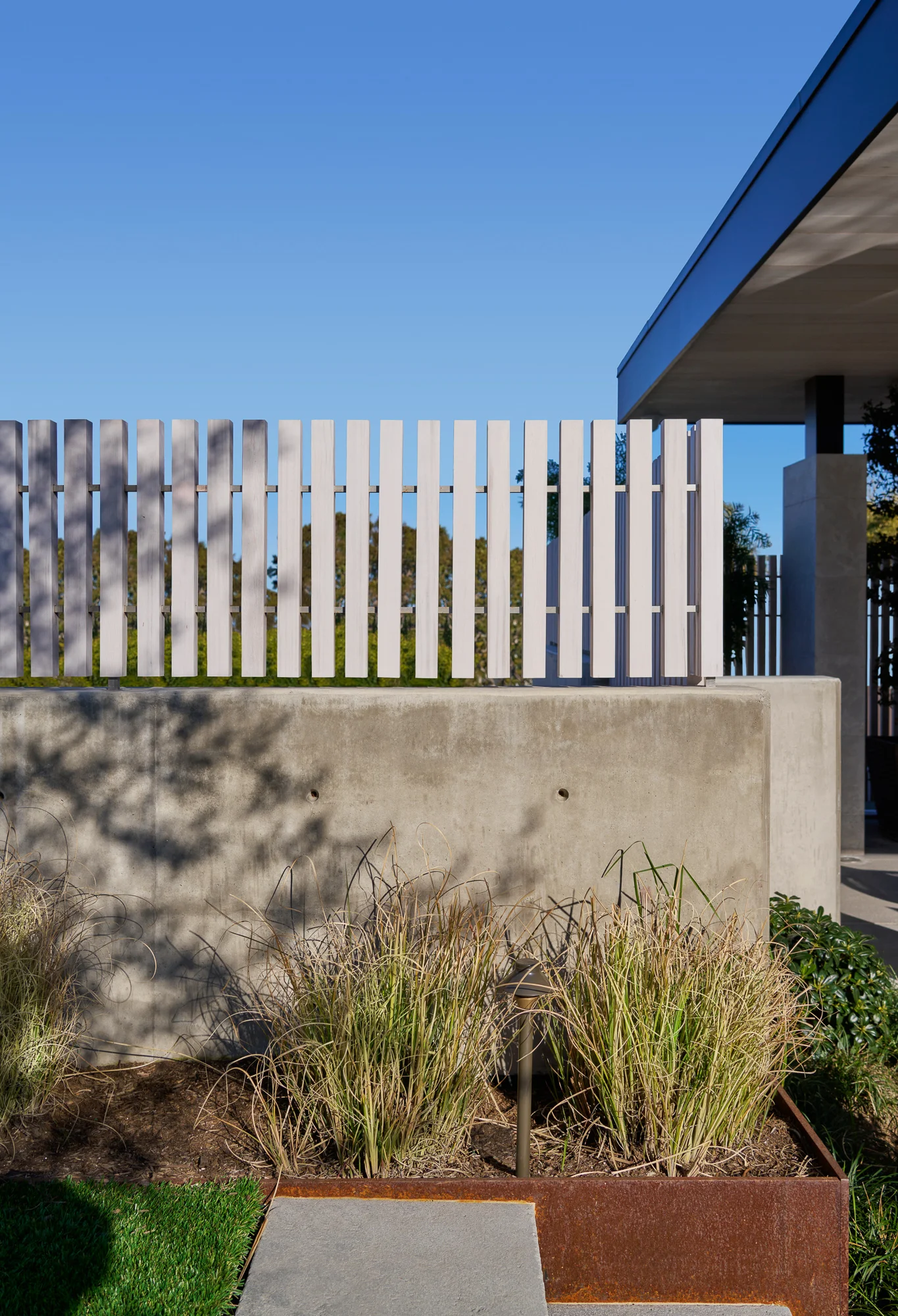 The site walls are natural wood-tone vertical pickets inspired by classic dune fence imagery. The same linear motif translates into the trellis display of shadow patterns across the facade