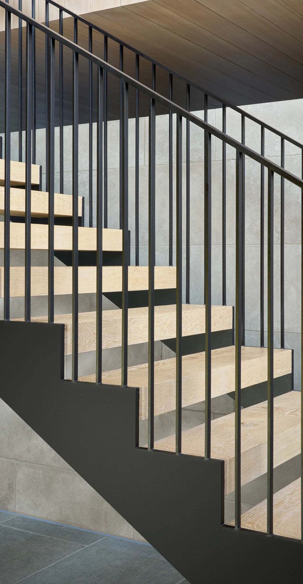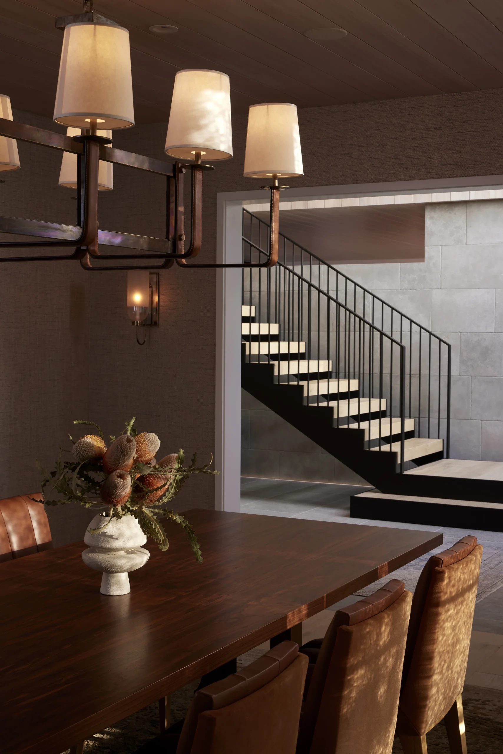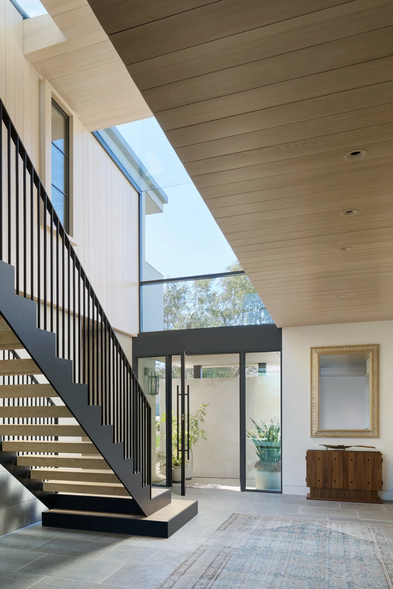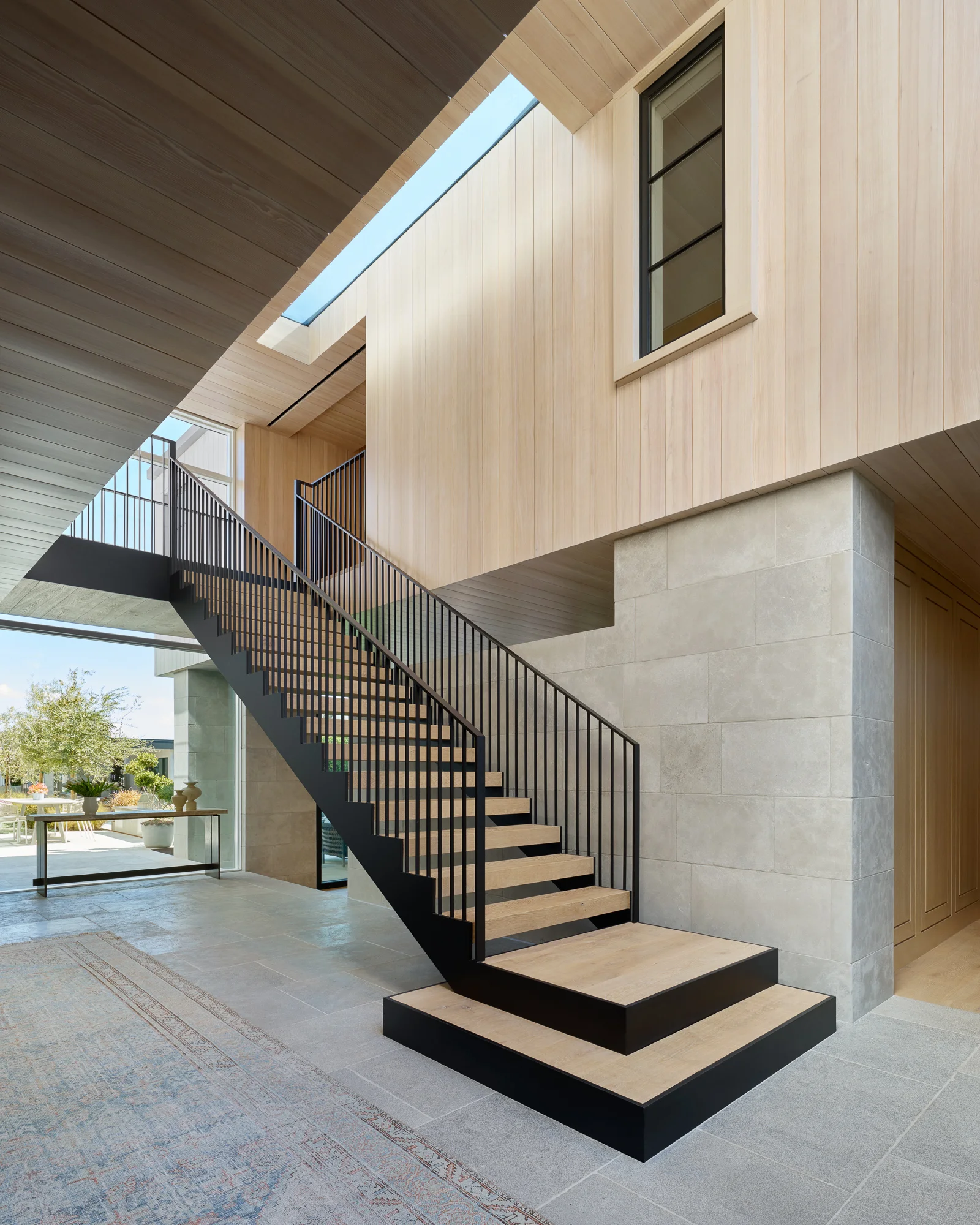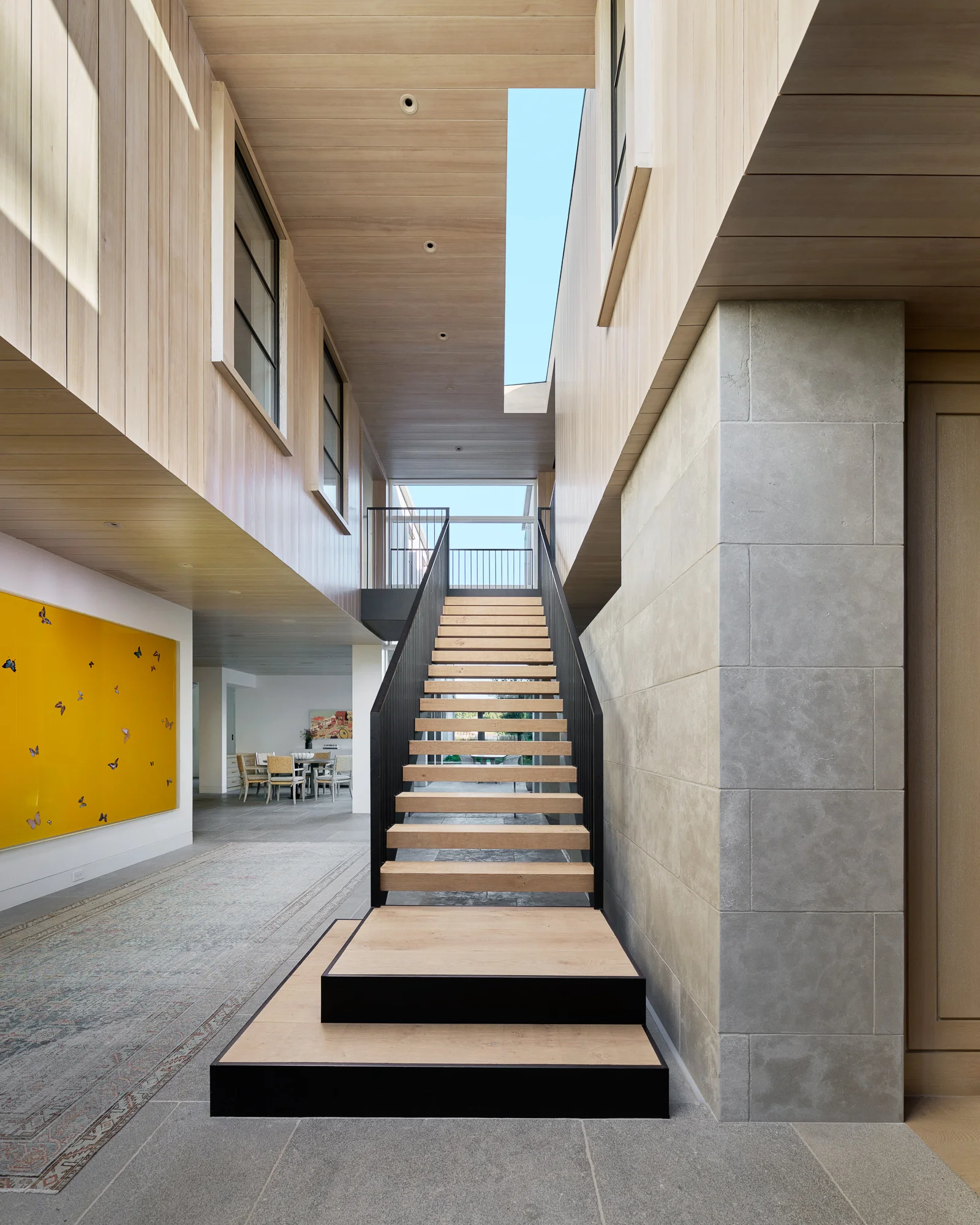 A partial glass roof affords abundant natural daylight to penetrate the heart of the home while celebrating the monumental stair